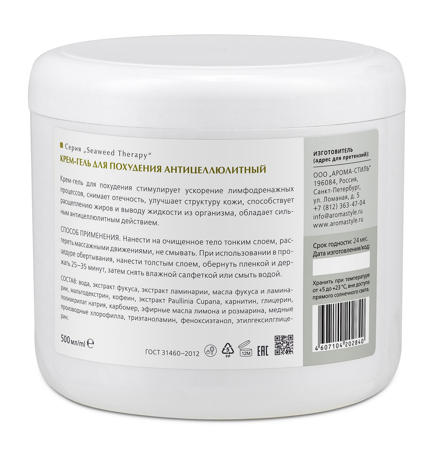 Способ применения: Нанести на очищенное тело тонким слоем, растереть массажными движениями, не смывать, либо нанести толстым слоем и обернуть пленкой, держать 20–25 минут и снять влажной салфеткой. Также рекомендуется применять как водорослевое обертывание.