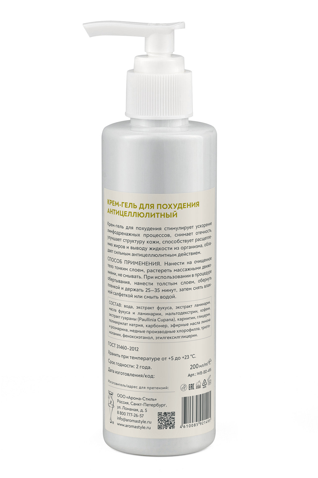 Способ применения: Нанести на очищенное тело тонким слоем, растереть массажными движениями, не смывать, либо нанести толстым слоем и обернуть пленкой, держать 20–25 минут и снять влажной салфеткой. Также рекомендуется применять как водорослевое обертывание.
