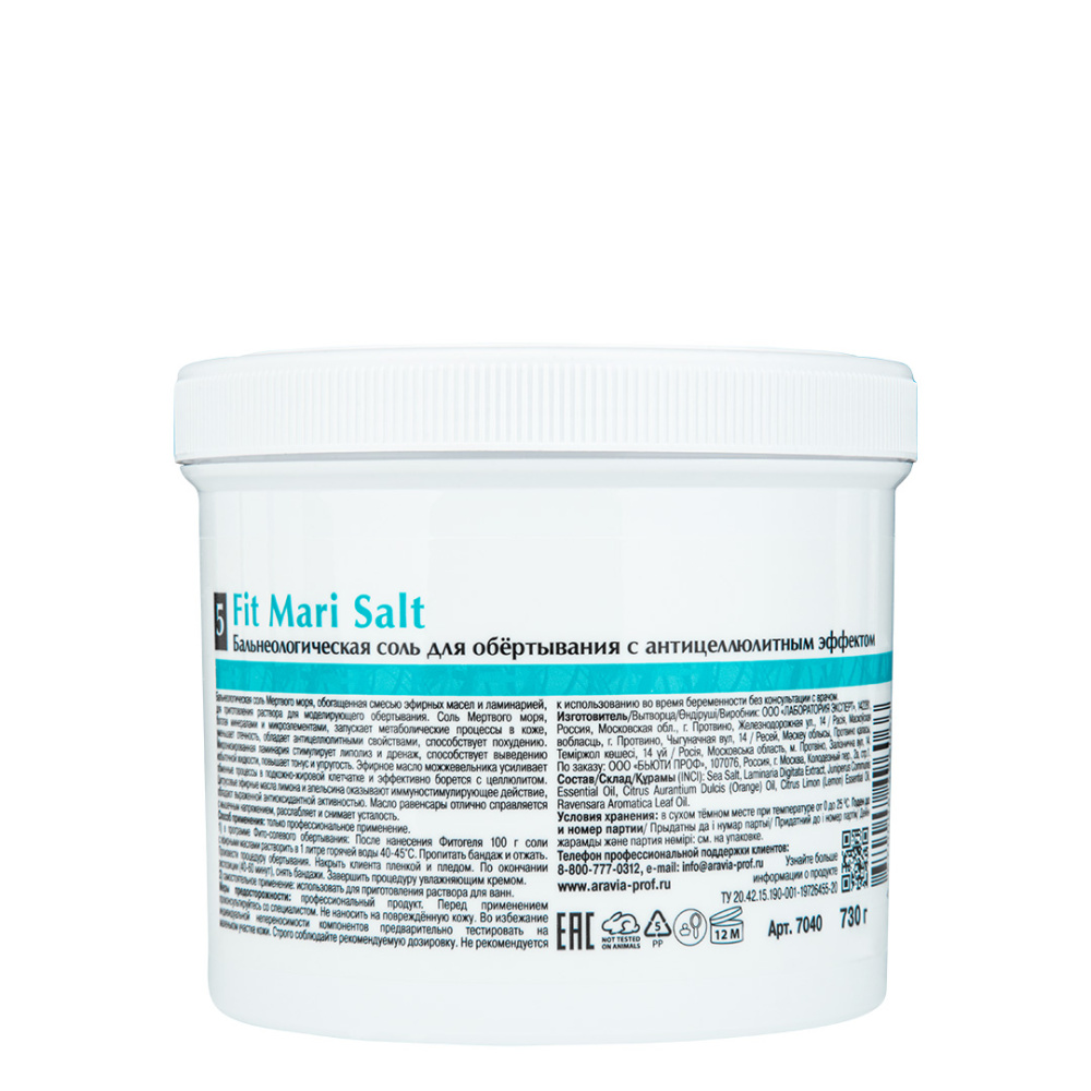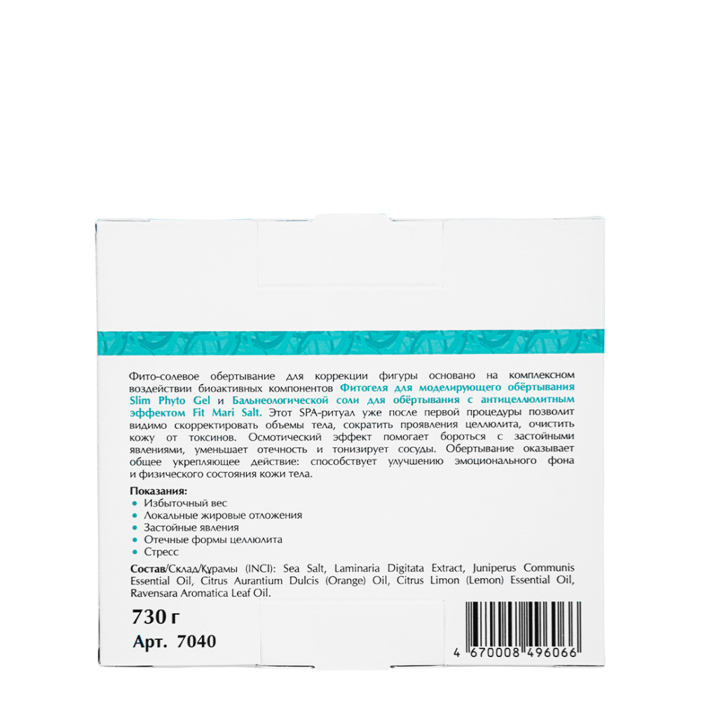 Описание: бальнеологическая соль для обертывания с антицеллюлитным эффектом - II этап фито-солевого обертывания. Обогащенная смесью эфирных масел и ламинарией. Соль Мертвого моря, богатая минералами и микроэлементами, запускает метаболические процессы в коже, уменьшает отечность, обладает антицеллюлитными свойствами, способствует похудению. Соль увеличивает абсорбционную способность кожи и способствует диффузии активных компонентов фитогеля через верхние слои эпидермиса для достижения высокого результата. Микронизированная ламинария стимулирует липолиз и дренаж, способствует выведению избыточной жидкости, повышает тонус и упругость. Эфирное масло можжевельника усиливает обменные процессы в подкожно-жировой клетчатке и эффективно борется с целлюлитом. Цитрусовые эфирные масла лимона и апельсина оказывают иммуностимулирующее действие, обладают выраженной антиоксидантной активностью. Масло равенсары отлично справляется с мышечным напряжением, расслабляет и снимает усталость. Ароматические свойства эфирных масел оказывают благоприятное воздействие на организм: успокаивают, улучшают эмоциональный фон.