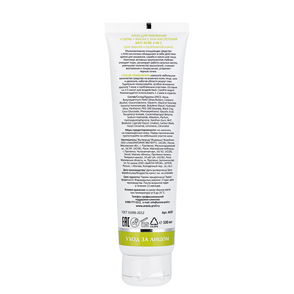 Описание: мультиактивное очищающее средство с AHA-кислотами объединяет в себе действие крема для умывания, скраба и маски для лица. Комплекс активных компонентов глубоко очищает поры, регулирует работу сальных желез, уменьшает количество высыпаний, снимает воспаления и покраснения, устраняет черные точки. Средство выравнивает рельеф и тон кожи, сглаживает следы постакне, увлажняет и повышает упругость кожи.