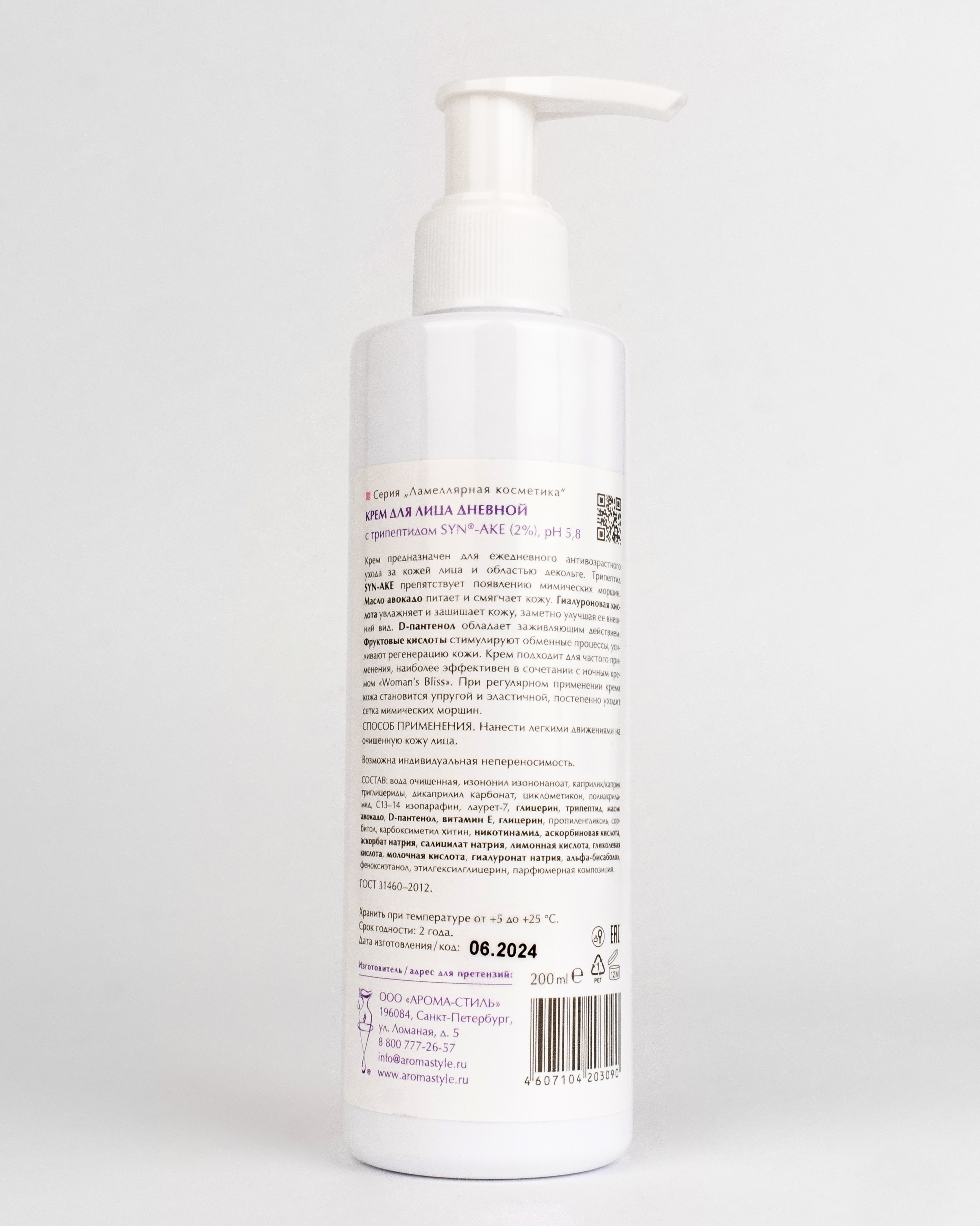 Описание: крем Day Cream With Syn-Ake от бренда Woman's Bliss предназначен для ежедневного антивозрастного ухода за кожей лица и областью декольте. Действие трипептида SYN-AKE (аналог яда храмовой гадюки производства Pentapharm, Швейцария) направлено на непосредственное и длительное расслабление лицевых мускулов, ответственных за создание мимических морщин.