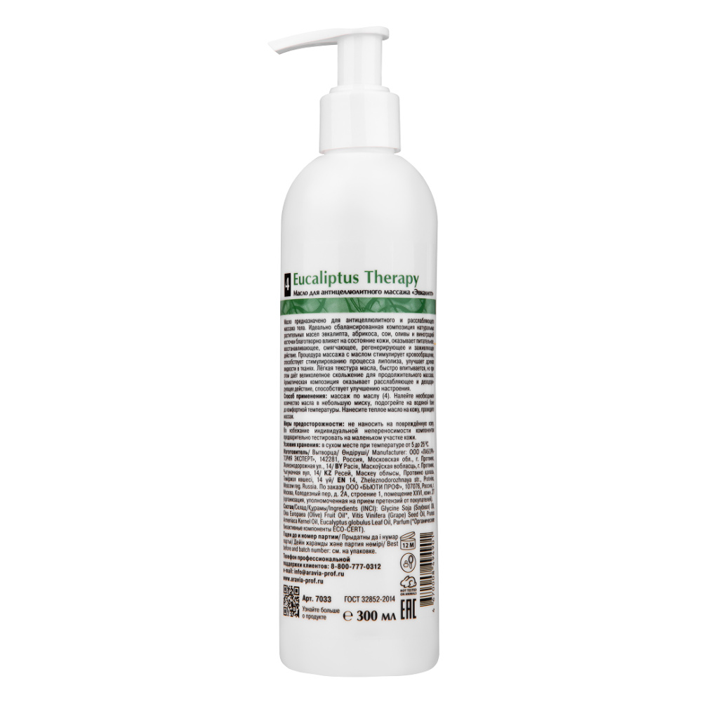 Описание: идеально сбалансированная композиция натуральных растительных масел эвкалипта, абрикоса, сои, оливы и виноградной косточки благотворно влияет на состояние кожи, оказывает питательное, восстанавливающее, смягчающее, регенерирующее и заживляющее действие. Процедура массажа с маслом стимулирует кровообращение, способствует стимулированию процесса липолиза, улучшает дренаж жидкости в тканях.