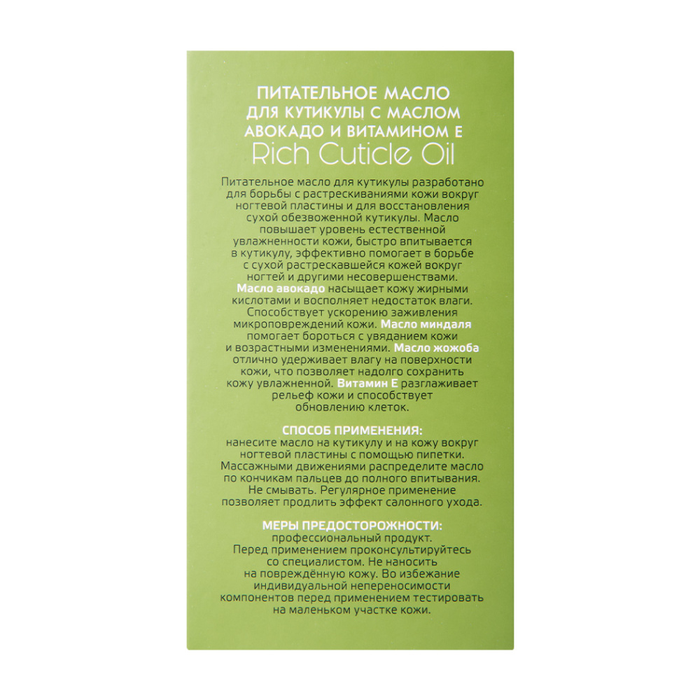 Способ применения: нанесите масло на кутикулу и на кожу вокруг ногтевой пластины с помощью пипетки. Массажными движениями распределите масло по кончикам пальцев до полного впитывания. Не смывать. Регулярное применение позволяет продлить эффект салонного ухода.