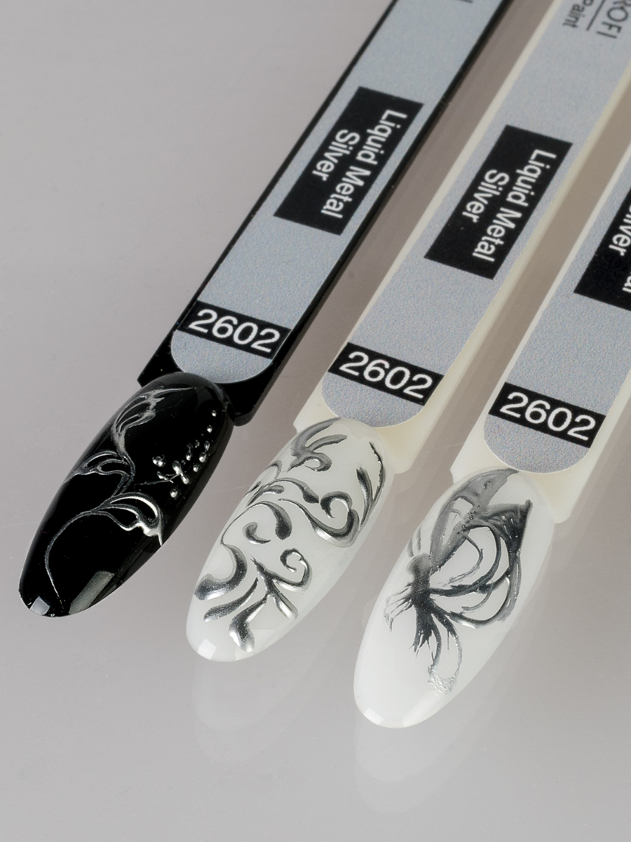 Описание: Гель-краска Жидкий Металл густой консистенции серебристого цвета. Позволяет легко, двумя штрихами, сделать красивый дизайн на ногтях.