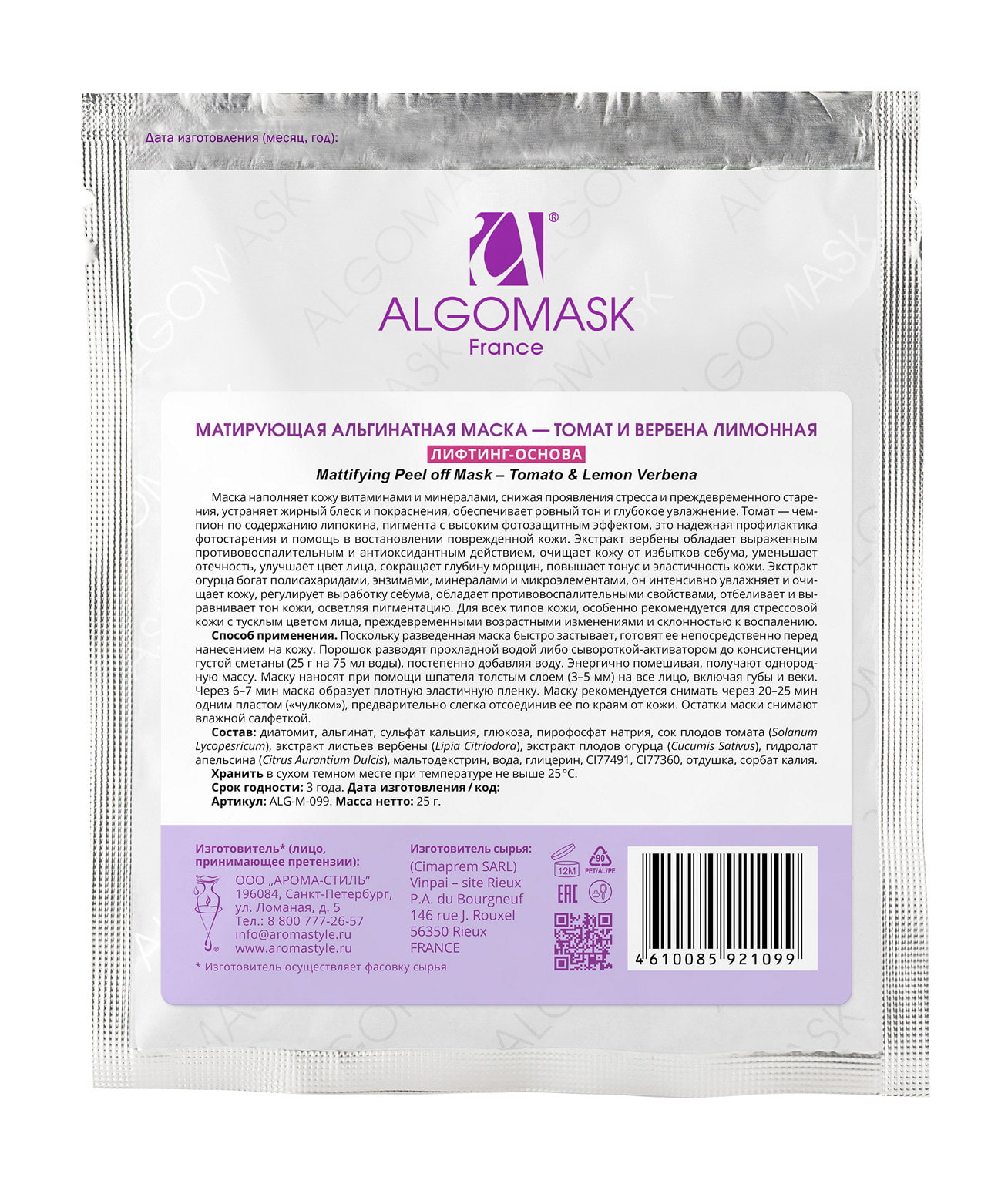 Состав: Диатомит, альгинат, сульфат кальция, глюкоза, пирофосфат натрия, сок плодов томата (Solanum Lycopesricum), экстракт листьев вербены (Lipia Citriodora), экстракт плодов огурца (Cucumis Sativus), гидролат апельсина (Citrus Aurantium Dulcis), мальтодекстрин, вода, глицерин, CI77491, CI77360, отдушка, сорбат калия.