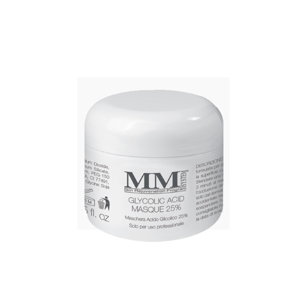 Кремообразная маска с содержанием гликолевой кислоты Glycolic Acid Masque 25% используется для легкого поверхностного пилинга. Препарат может применяться как профилактическое средство в целях теста на чувствительность к гликолевой кислоте, так же в качестве первых процедур перед курсом гликолевых пилингов.