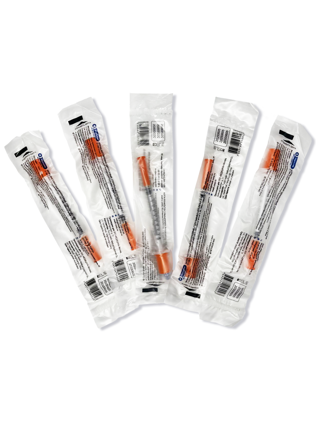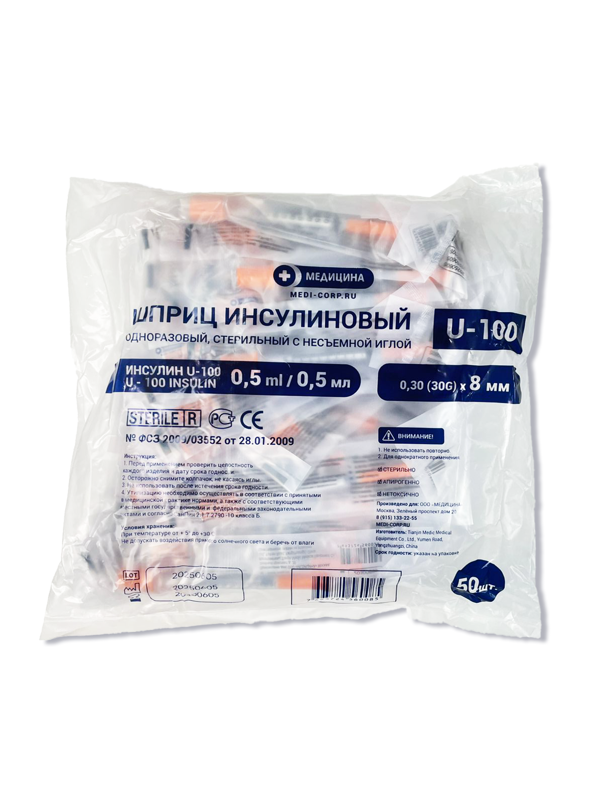 Описание: Медицинское изделие представляет собой одноразовый стерильный внутри нетоксичный пластиковый шприц с несъёмной иглой. Изделия объёмом 0,3мл., 0,5мл., 1мл состоят из цилиндра шприца, стопора и поршня шприца, колпачка поршня, соединения иглы и втулки, защитного колпачка иглы. Во всех вариантах исполнения шприца игла закрыта полиэтиленовым съёмным защитным колпачком, на шток поршня надевается полиэтиленовый колпачок. Все варианты исполнения шприца стерильны внутри. Стерильность обеспечивается при помощи защитного колпачка иглы и колпачка поршня. Шкала маркировки цилиндра рассчитана на концентрацию инсулина 100U/мл (U-100) и 40U/мл (U-40). Шприцы имеют цветовую кодировку оранжевого и красного цвета. Шприцы доступны со следующим размером иглы: 0,30 (30G) х 8мм; 0,33 (29G) х 12,7мм..